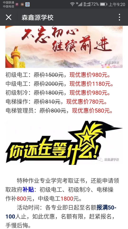 为庆祝森鑫源建校20周年,为感谢社会各界对学校的支持,学校此次回馈一大波福利给各位新老学员,以表示对各位新老学员与学校20年来风雨同舟,初心不改,即日起,学校的的热门专业电工、制冷、电梯都以超低优惠价...